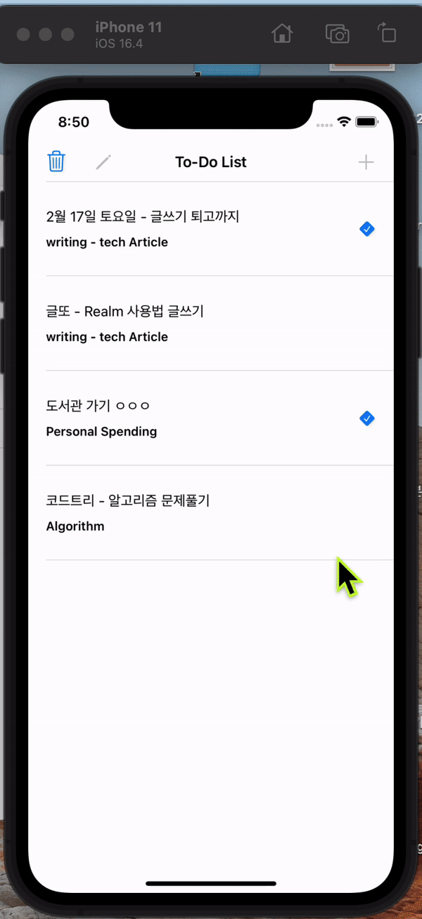 삭제는 realm 안에 데이터에 .delete 메소드 안 테이블뷰셀 데이터 → cellData 를 넣어줬어요.