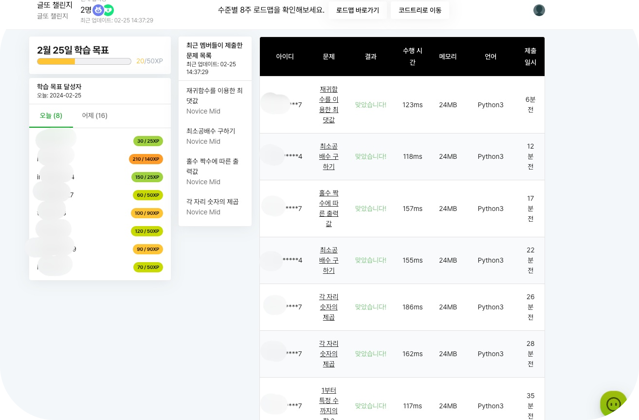 4. 글또 챌린지로 어떤 사람들이 현재 문제를 풀고 xp 를 많이 채웠는지 실시간 확인이 가능하다.