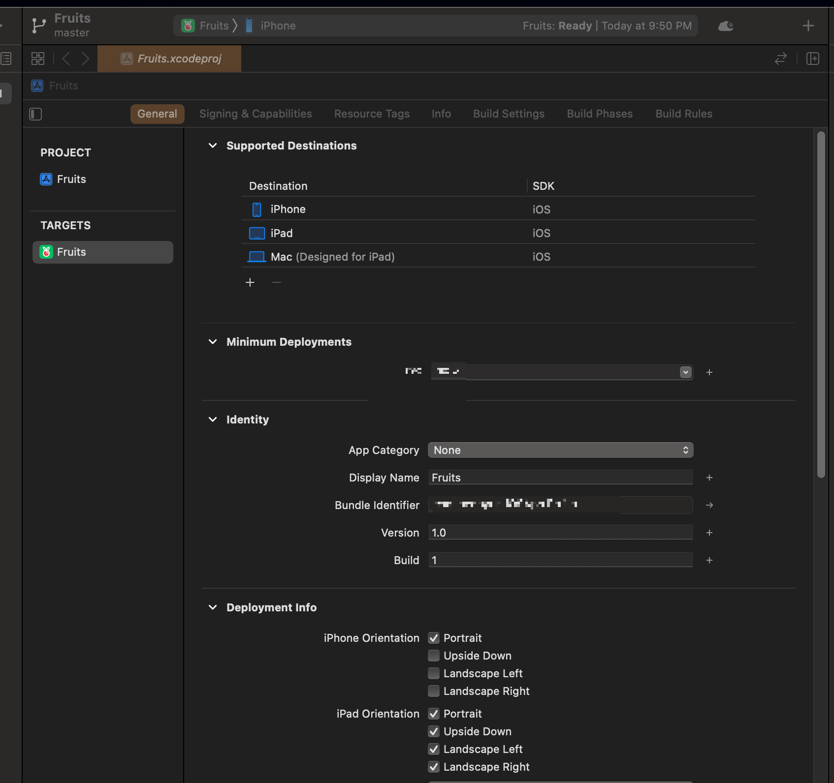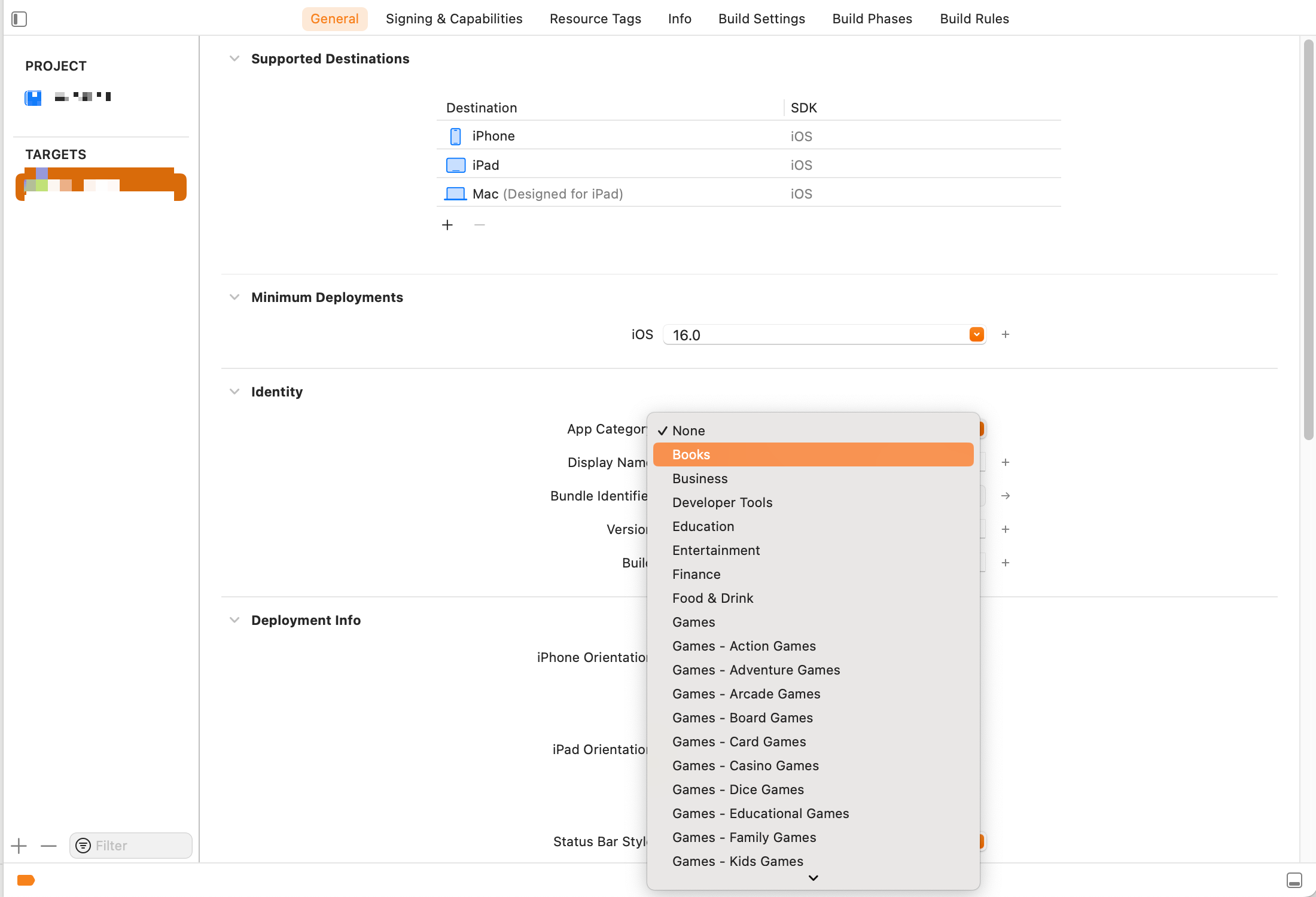 target - General 패널 - 사용하는 디바이스 종류 선택 - Identity 에서 개발자가 만든 앱의 성향에 따라 App Category 를 선택해주면 끝!