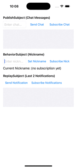 즉, 구독 전 발생한 값을 받을 수 있냐 없냐의 차이일 것 같다. 닉네임변경은 현재 상태 유지를 위함이고, 채팅 메시지(혹은 상태메시지라고 가정한다면) 이벤트 기반 데이터스트림이기 때문에 PublishSubject 타입을 차용해야할 것이다.