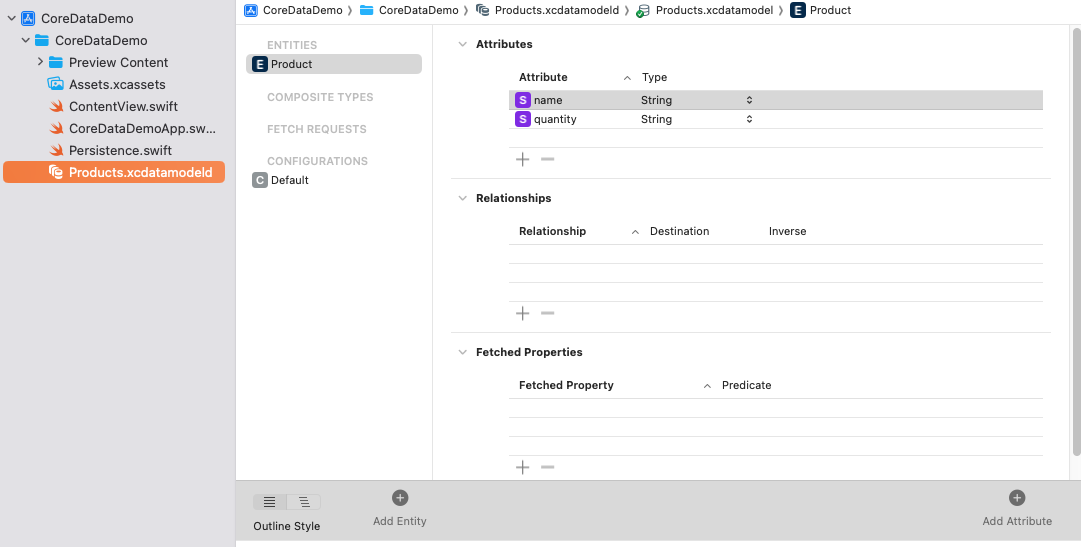- Core Data는 다양한 데이터 타입(문자열, 숫자, 날짜 등)을 속성으로 지원한다.