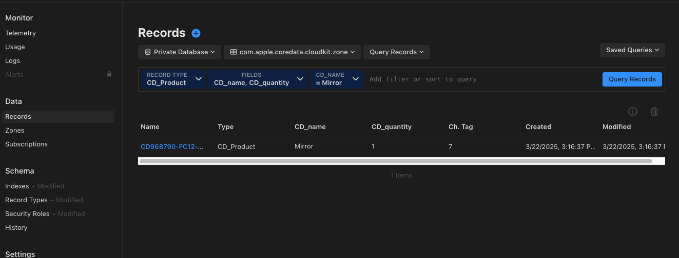 Private Database, com.apple.coredata.cloudkit.zone, QueryRecords 로 설정해 저장된 데이터를 조회한다.