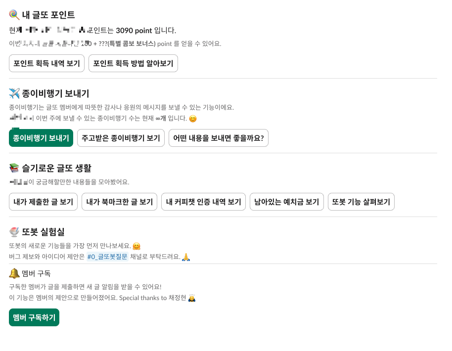 🪄 또봇, 글빼미 - 또봇은 오늘도 열일을 한다. 또봇은 종이비행기 보내기 관리와 글또 생활을 편리하게 할 수 있는 제출 글보기, 인증내역, 예치금 보기도 있다. 글빼미는 내가 작성한 글의 피드백과 글자 수를 세주고, 최근에는 순한맛, 마늘맛, 매운맛, 핵매운맛(?) 등으로 피드백을 주는 기능이다. (+ 글빼미는 글 제출 어뷰징을 막기 위한 자동화된 글 제출 검수 봇이다.)