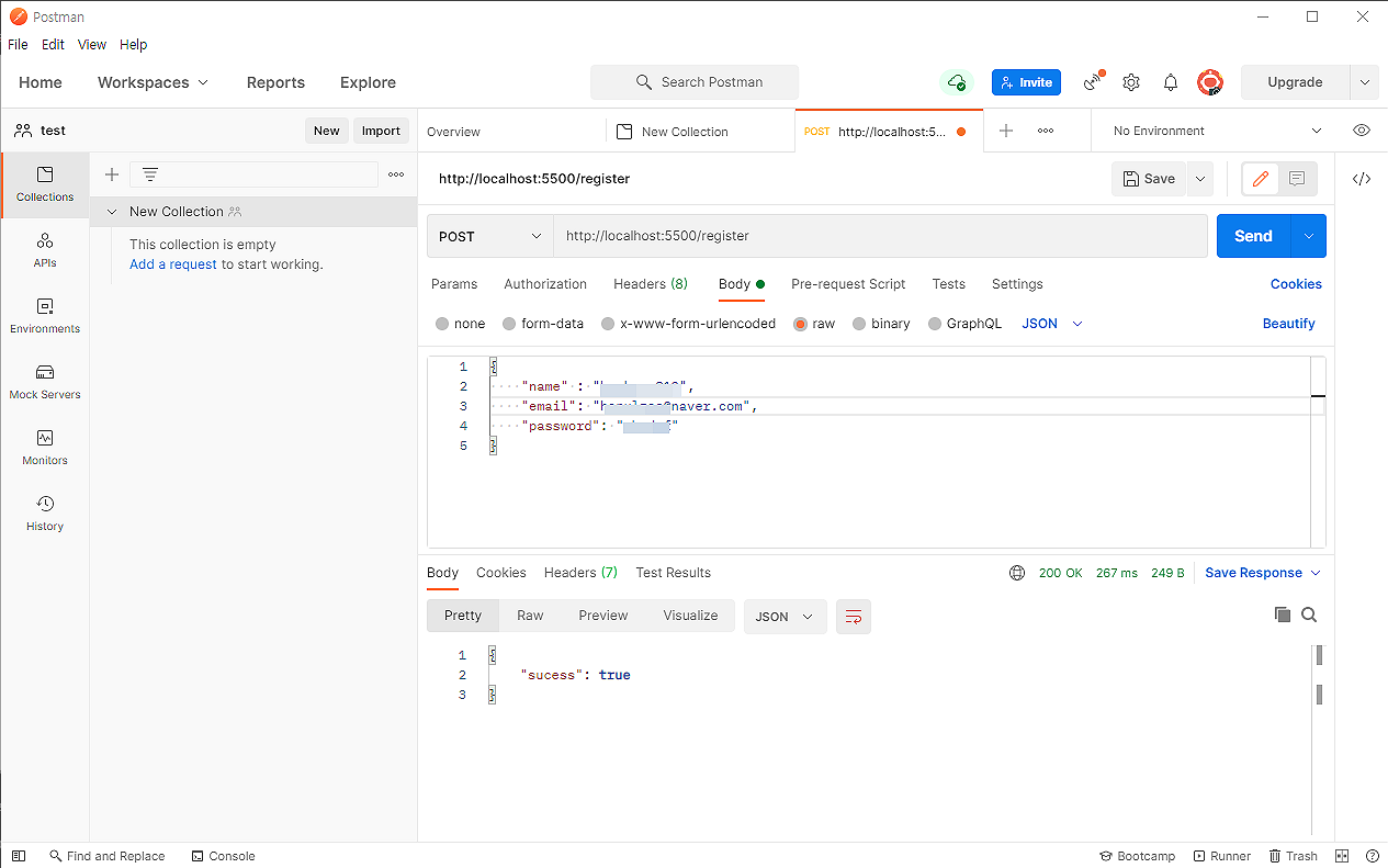 전에 저장할때 res.json 에러이면 에러표시를 띄어주고 status(성공)이면 success:true 로 표시되게 코드를 지정해줬기 때문에 postman에서 테스트를 했을 때, success: true로 뜨면 성공이다.
