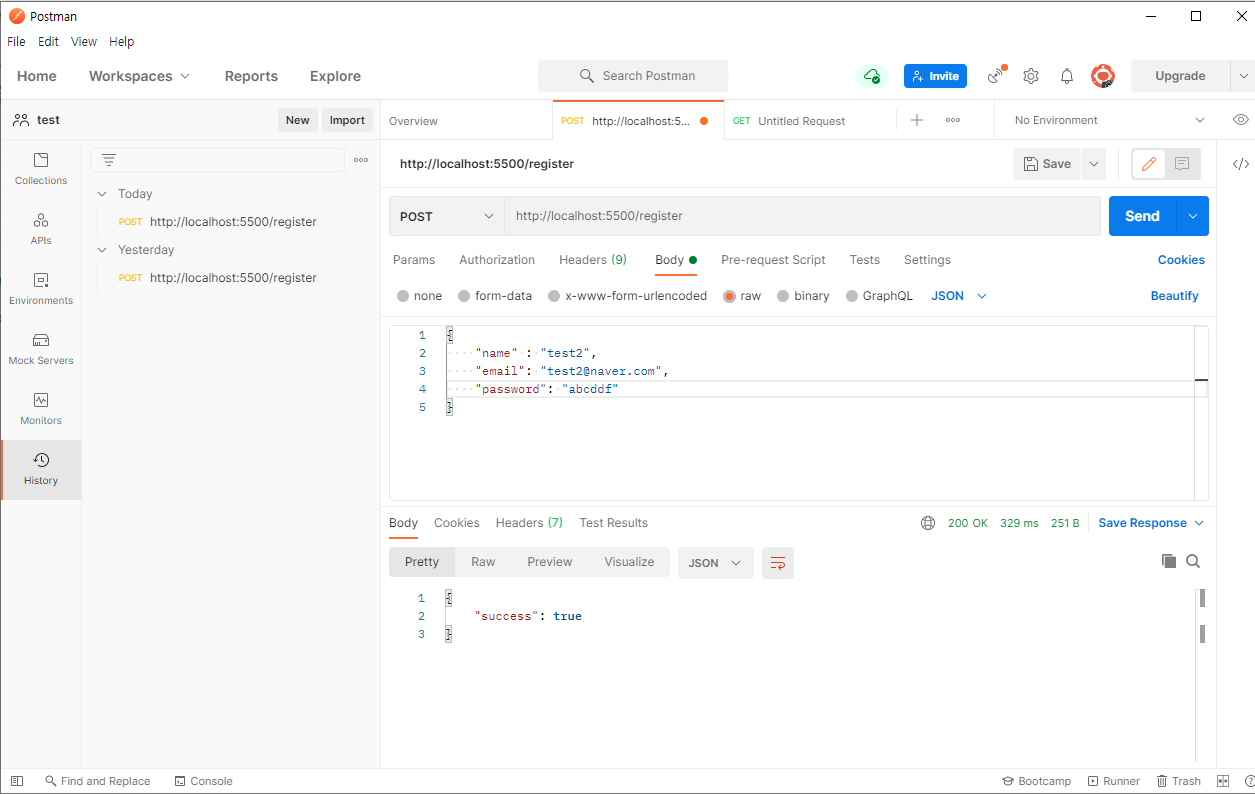 1. 처음에 postman 설치하고 test로 쳐본 나의 이메일 계정과 비밀번호