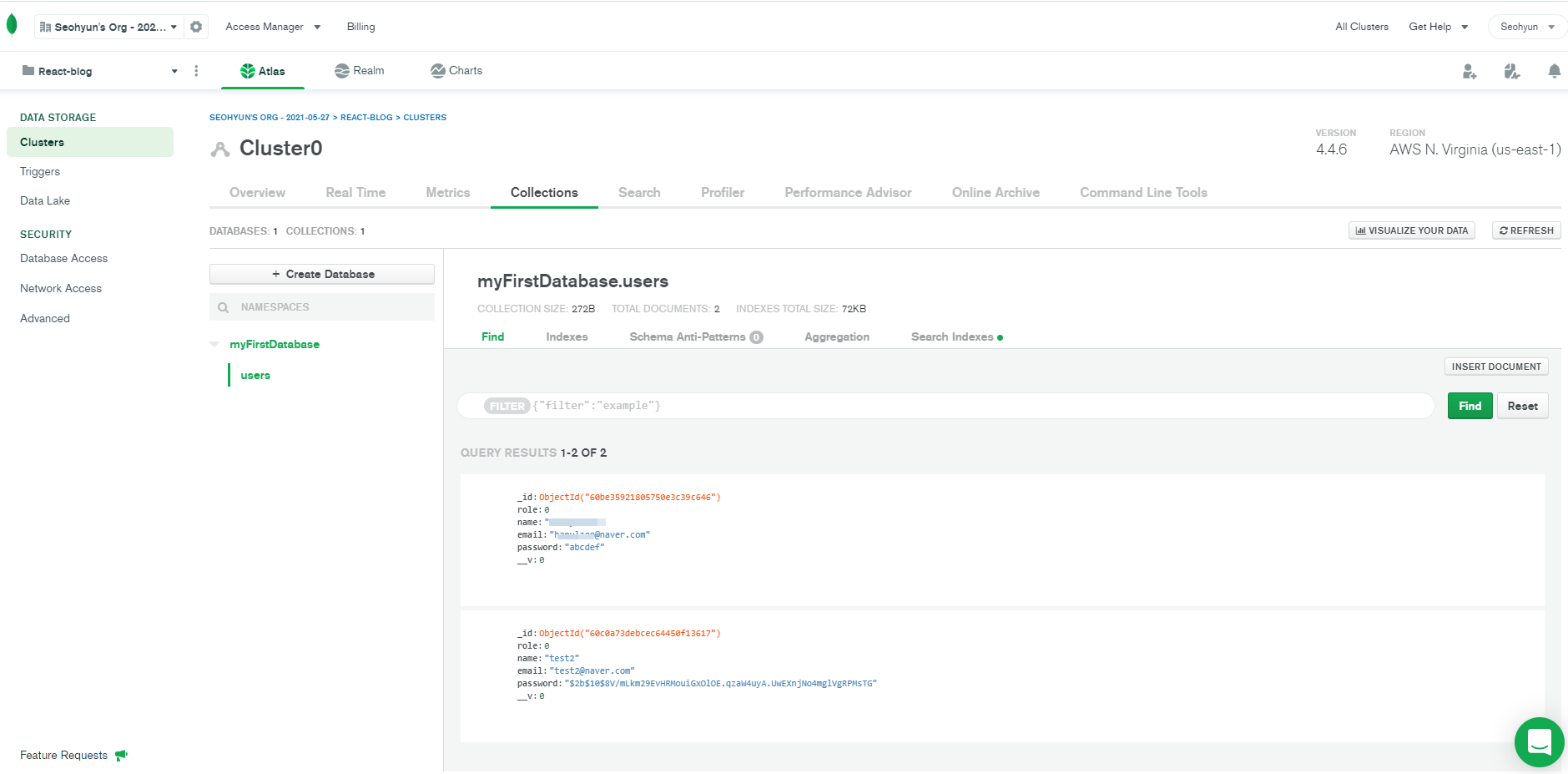 [ mongoDB 클러스터에 나의 database 저장소 안에 Test 결과 확인]