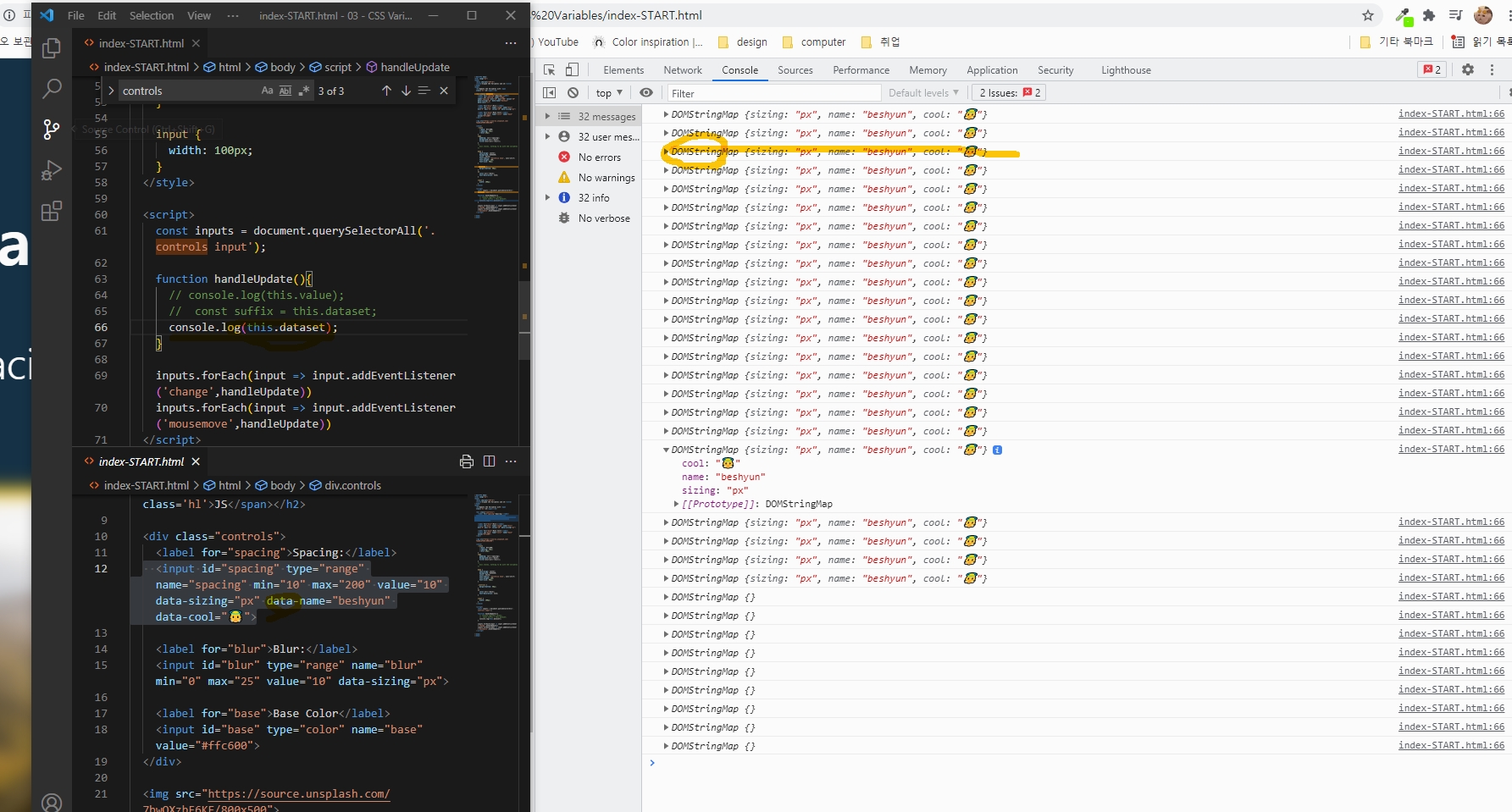 이 자바스크립트 코드를 이해하자면, input태그들의 각각의 input 태그들의 이벤트 값들에 mousemove 마우스가 움직일때, handleUpdate라는 함수의 dataset 값에 대해 표시가 된다.