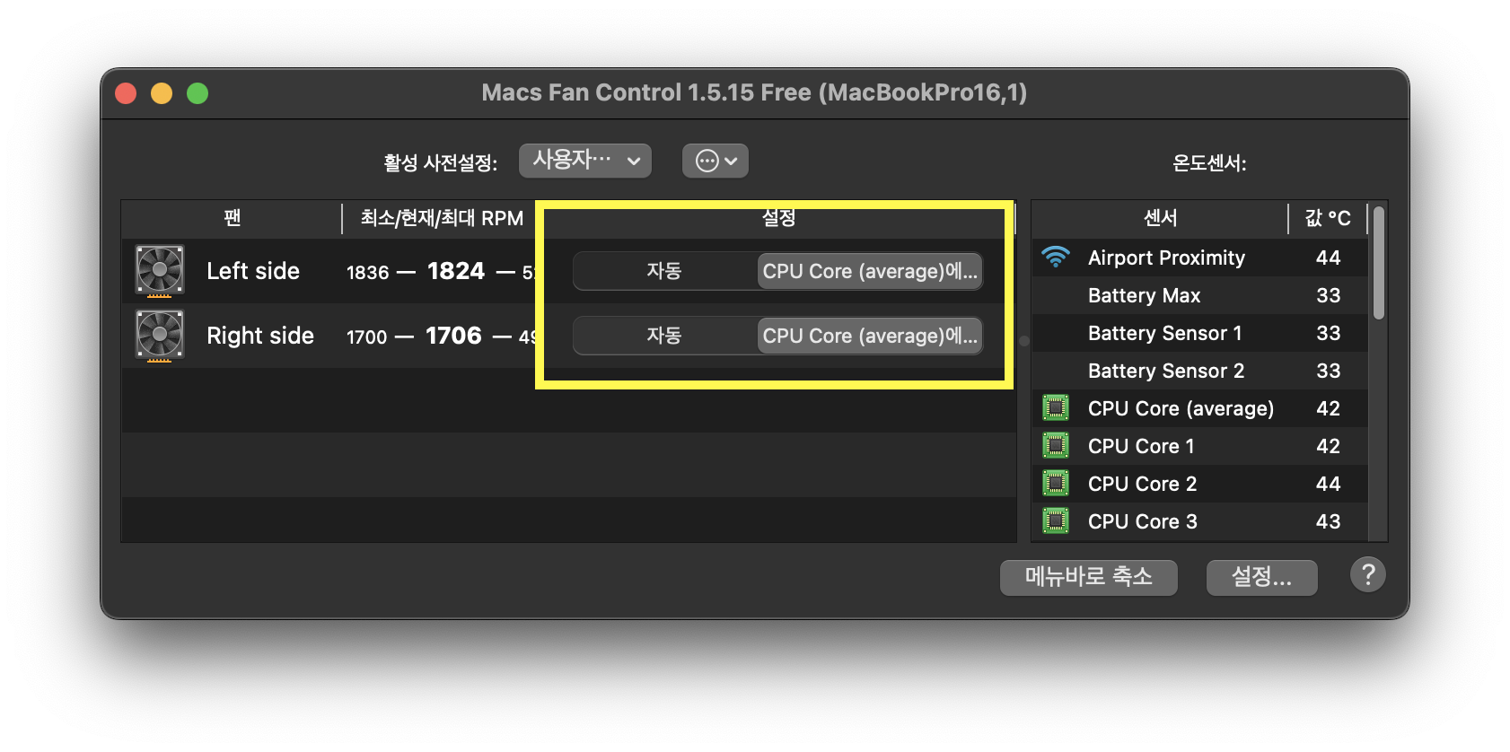 인텔 칩 맥북프로로 취업 전까지는 버텨보려고 잘 관리해야겠다. 아마 온도조절이나 뜨거운게 싫은 사람이라면 PECI 로 선택해서 세팅할 것 같다. 제일 우측에는 현재 온도를 보여주는 것 같다.