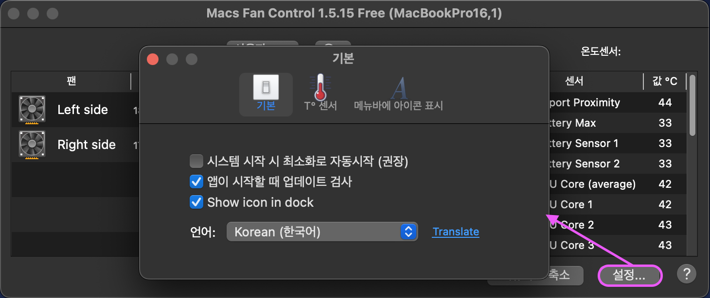 온도센서 아래 설정을 누르면 기본 설정을 할 수 있고, 언어 세팅이나 온도 센서에 대한 설정도 할 수 있다.