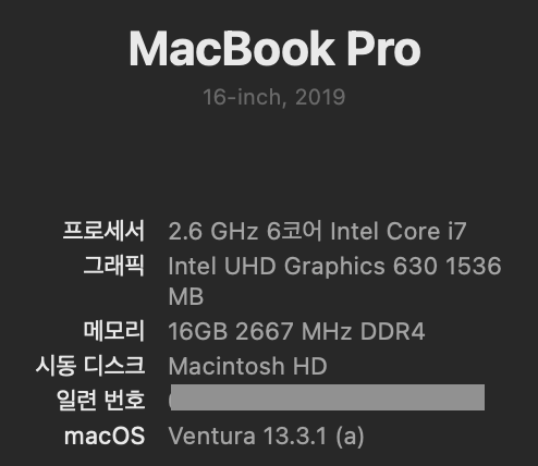 나는 2019년형 맥북 프로 16인치 인텔 칩을 쓰고 있다. ( 생산연도는 2020년이지만 무튼 2019년도..)