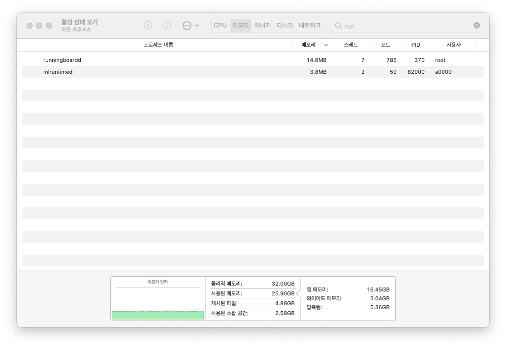 메모리 압력 밑에 색이 칠해진 그래프가 보이실 겁니다. 차트가 빨갛거나 노란색이면 Mac이 메모리 부족으로 헐떡이고 있는 것을 의미합니다. 직관성이 떨어지지만, 결국 Mac에서 사용할 수 있는 메모리 양은 그렇게 중요하지 않습니다. 실제로 시스템은 사용 가능한 메모리 자원을 최대한 활용하려고 하기 때문입니다. 그에 반해 활성 상태 보기의 메모리 압력 그래프는 보기 보다 많은 것을 말해주므로 이따금 확인하는 습관을 들이는 게 좋습니다.