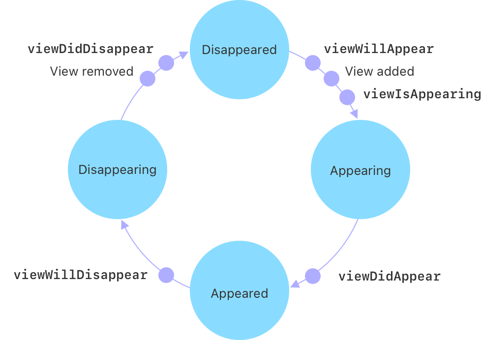 viewWillAppear(_ :)화면에 나타나기 전에 호출 ( 화면에 띄워줄 때마다 호출된다 )viewDidAppear(_ :)스크린에 뷰가 나타난 후 호출 ( 뷰의 애니메이션을 시작하거나, 타이머를 시작하는 등 화면이 나타난 후 필요한 작업 처리viewWillDisappear(_ :): 스크린에서 뷰가 사라지기 전에 호출, (애니메이션 멈추거나 타이머 종료시키는 등 작업처리)viewDidDisappear(_ :):스크린에서 뷰가 사라진 후 호출(화면이 스크린에서 내려간거지, 메모리 해제는 아님)