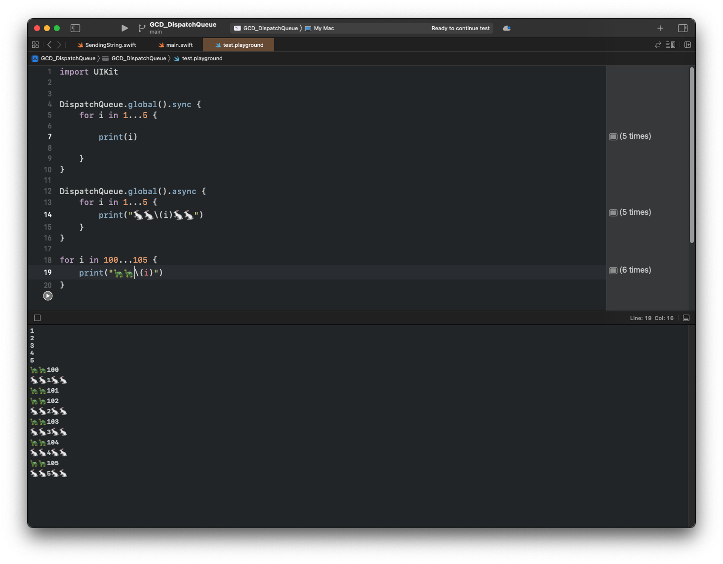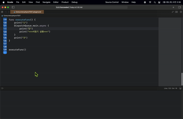 async 는 말 그대로 비동기이기 때문에 DispatchQueue.global().async 안의 코드가 언제 실행될지 모르니까 그 뒤의 작업(task)들이 기다리지 않아도 된다. 비동기적으로 일반적인 for in loop 프린트들과 뒤섞여서 동시적으로 순서 상관없이 실행되는 것을 볼 수 있다.